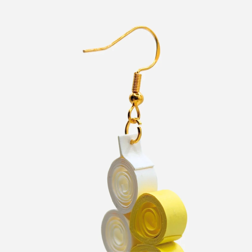 Immagina delle gocce di sole trasformate in gioielli. Ecco, più o meno è così. Questi orecchini sono realizzati con la tecnica del quilling, ovvero strisce di carta sapientemente modellate a mano fino a creare forme eleganti e luminose. In questo carta strisce di carta giallo e bianco vengono arrotolate, fissate e assemblate insieme per dare vita a questi pendenti a forma di margherita giallo sole.